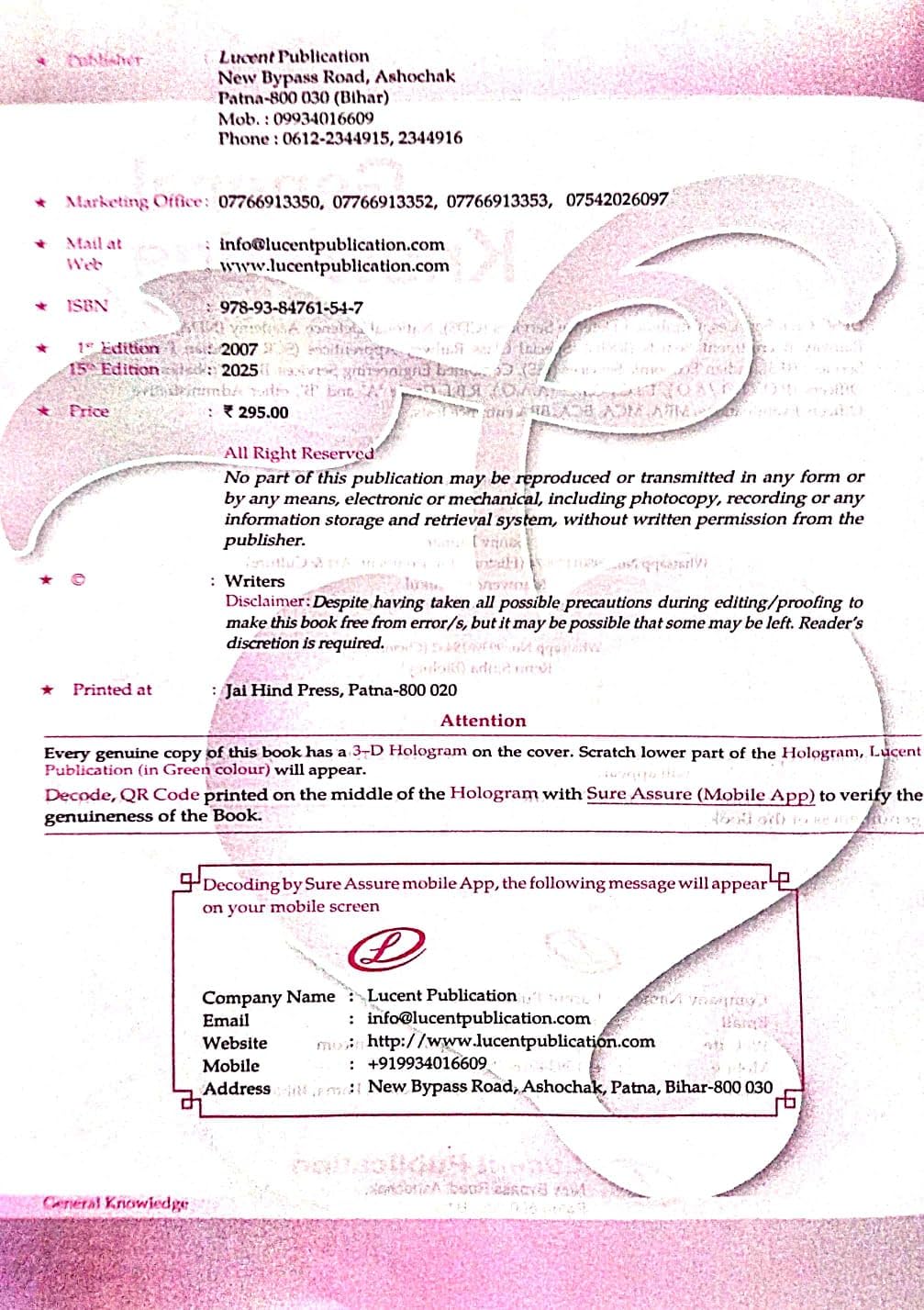 Publisher : Lucent Publications; 15th Edition (13 July 2025); Lucent Publications, New Bypass Road, Ashochak, Patna – 800030, Bihar