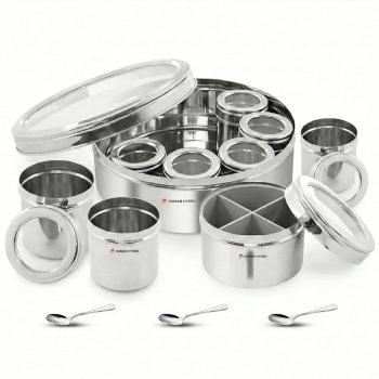 See-Through Lids for Easy Viewing – All 8 inner containers, the middle container with 4 partitions, and the outer masala dabba come with transparent lids, allowing quick spice identification.