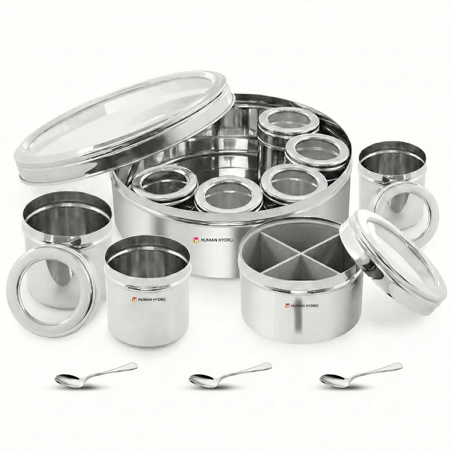 Human Hydro 12-in-1 Stainless Steel Masala Dabba | Spice Box with Partitioned Middle Container & 3 Spoons | See-Through Lid | Masala Container for Kitchen (22 cm, Silver)