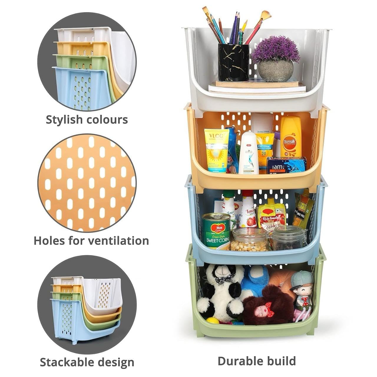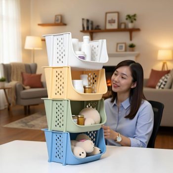 Multipurpose Plastic Basket Storage Rack with Wheels – Stackable Organizer Shelf (Pack of 3)