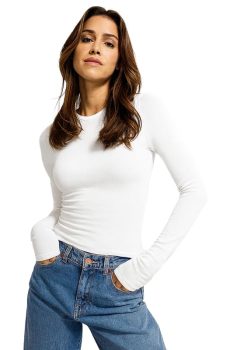 London Hills Women’s Cotton Blend Ribbed Long Sleeve Slim Fit Crew Neck Solid White T-Shirt for Casual & Daily Wear